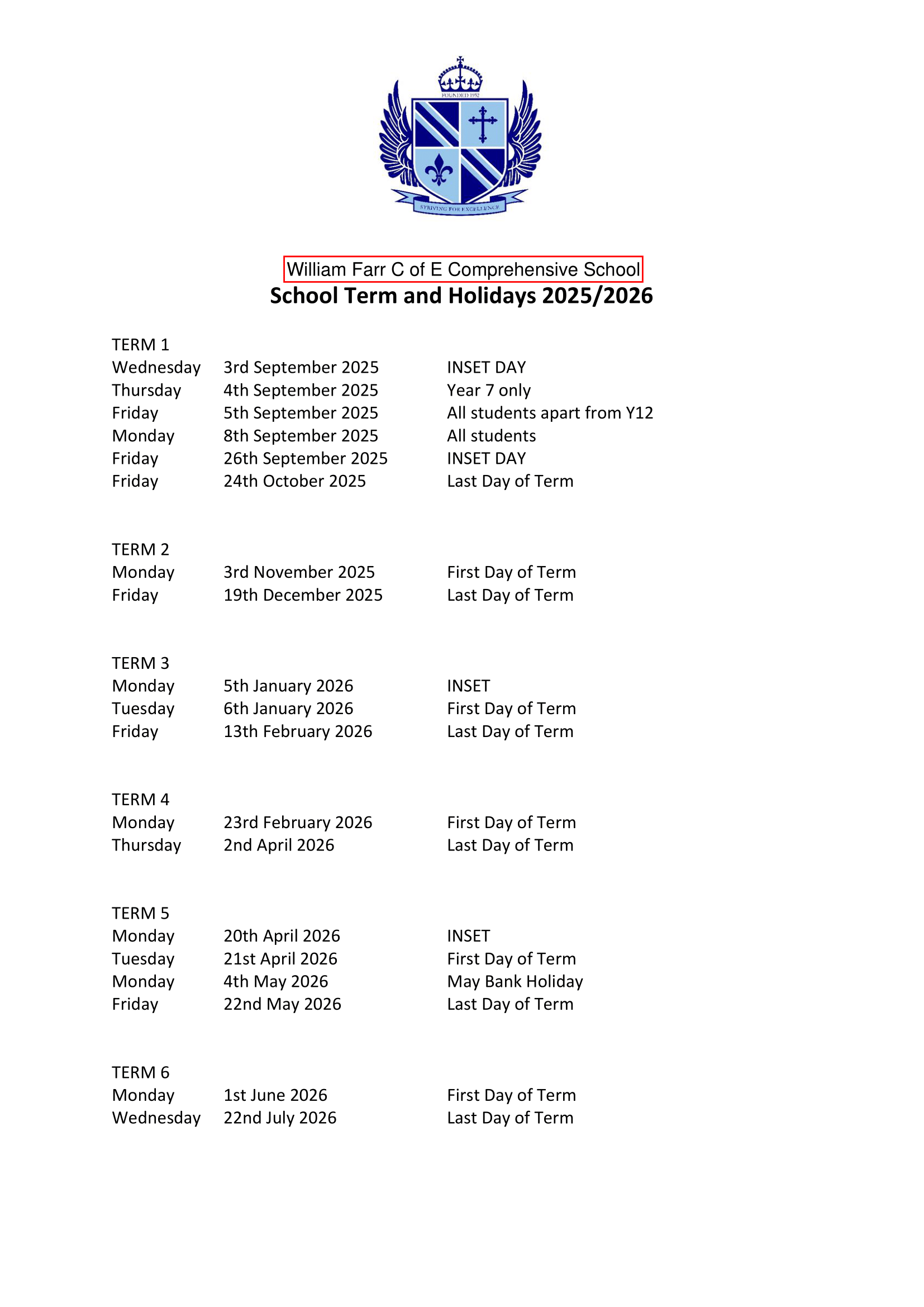 William Farr C of E Comprehensive School Term dates (2025-2026)