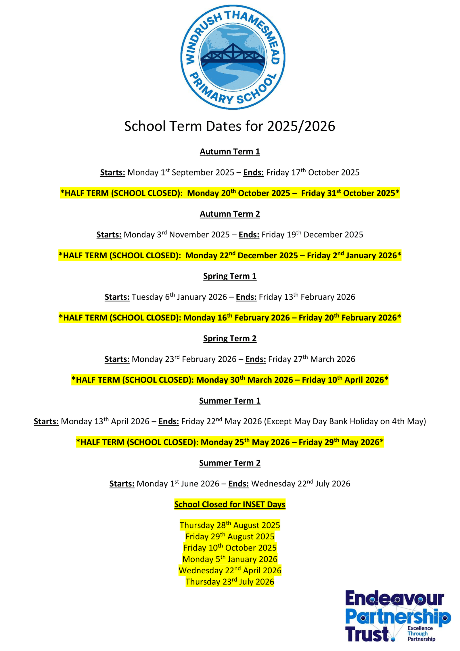 Windrush Thamesmead Primary School Term Dates 2025–2026