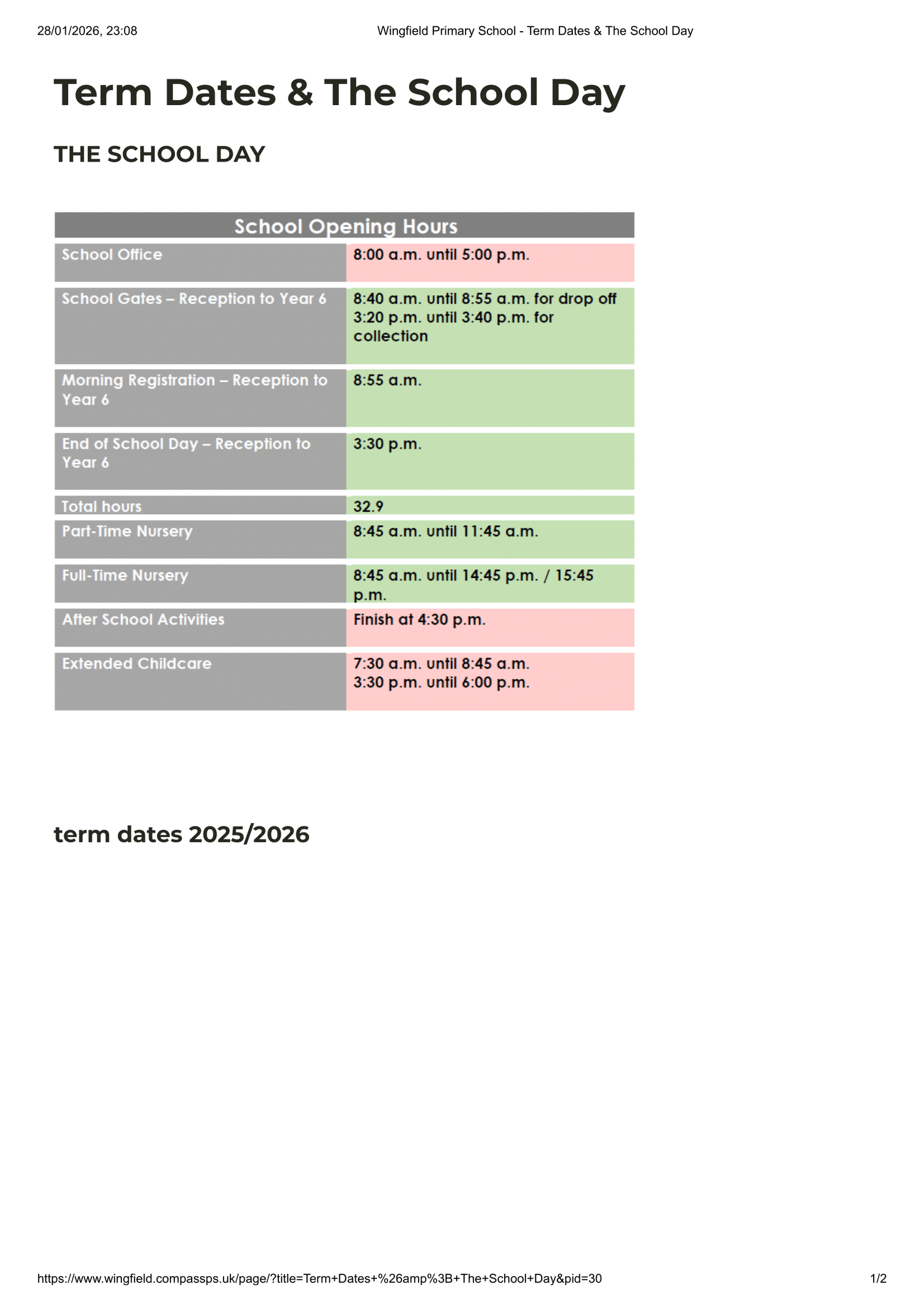 Wingfield Primary School Term Dates 2025–2026