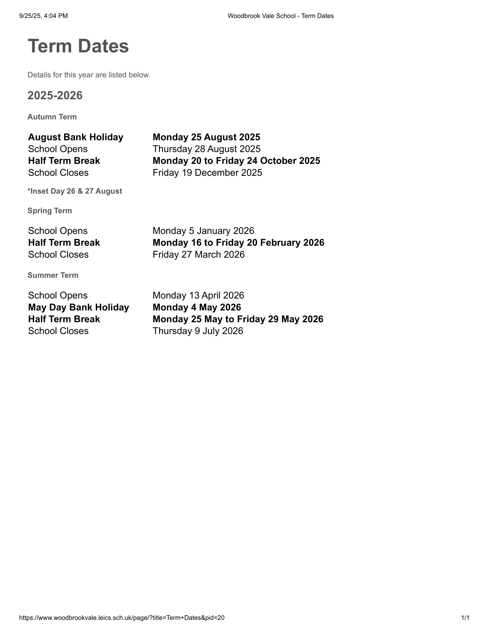 Woodbrook Vale School – Term Dates FAQ (Academic Year 2025–2026)