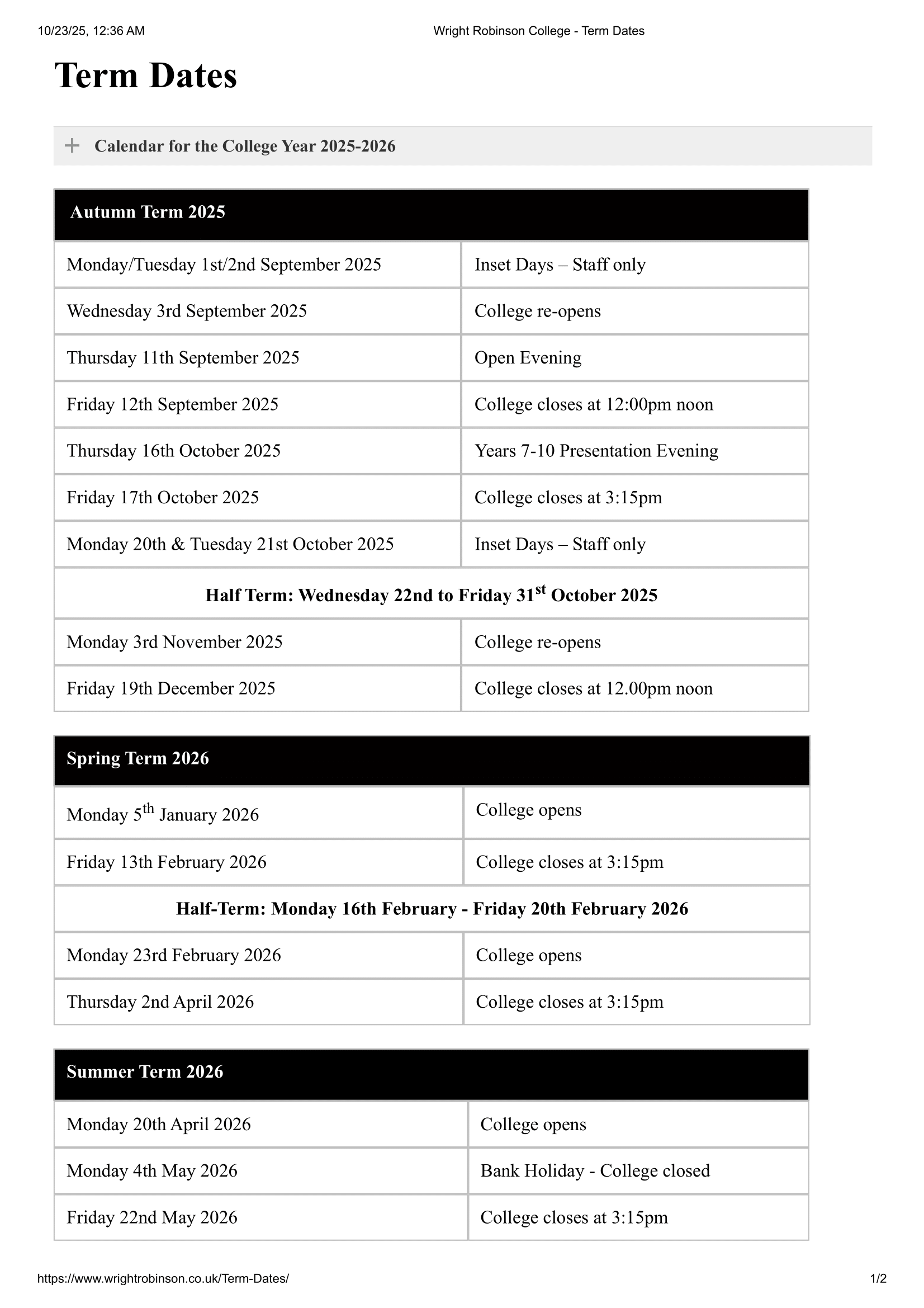 The Autumn Term 2025 at Wright Robinson College starts on Wednesday 3rd September 2025 and ends on Friday 19th December 2025.