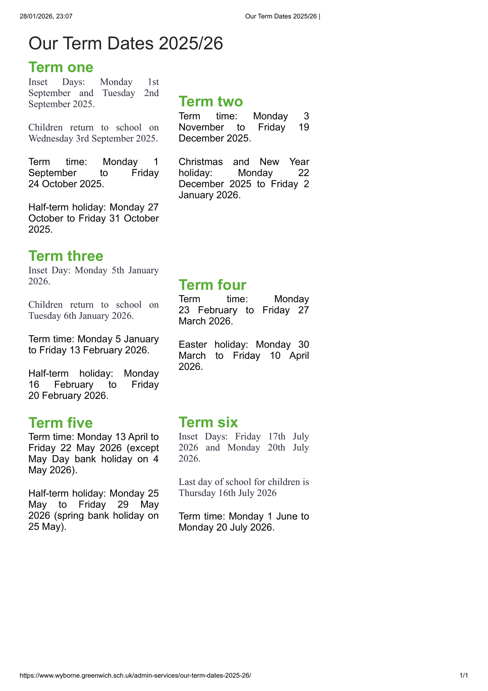 Please read: These dates are taken from the school’s published calendar for 2025–2026. Items reflect the legend categories (term dates, half terms, holidays, bank holidays, and inset days) exactly as shown on the calendar.