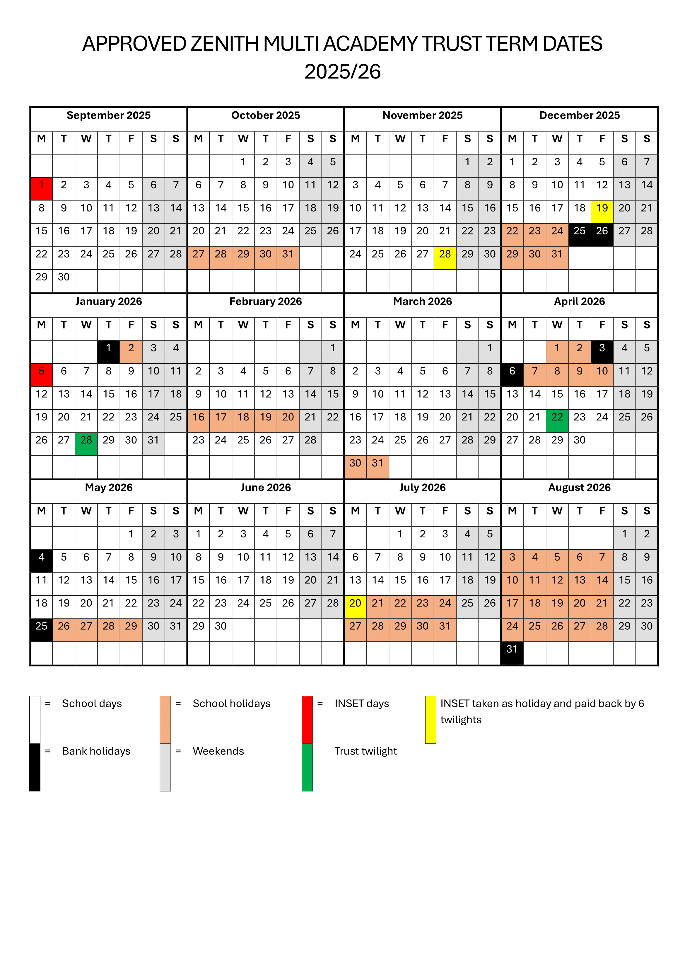 Zenith Multi Academy Trust Term dates (2025-2026)